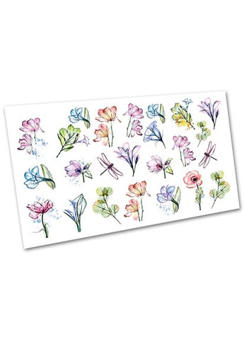 Водные наклейки для маникюра Цветы - готовый акварельный дизайн. Позволят разнообразить повседневный маникюр. Чтоб хорошо носились - нужно покрыть топом. Размер листа 8*5 см. Вырежьте нужный рисунок. Уложите бумажной стороной на салфетку смоченную водой. Дождитесь пока бумага промокнет, тогда осторожно отделите пленку с рисунком от бумаги и перенесите на ноготок. Закрепите рисунок топом.