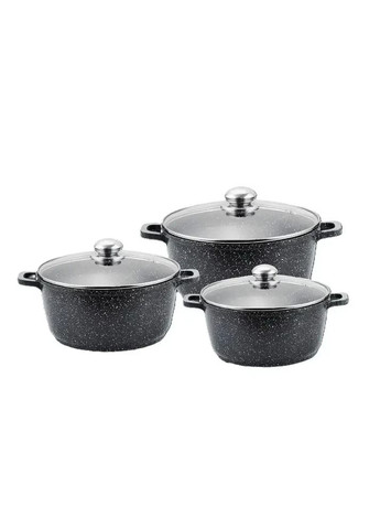 Набор кастрюль Benson с мраморным покрытием антипригарные. Изготовлен из литого алюминия - идеальный материал для жарки и тушения продуктов. Быстро и равномерно нагревается, особенно устойчив к деформации. Антипригарное покрытие с добавлением мраморной крошки - обеспечивает исключительную надежность и отличные антипригарные свойства. Сохранит пользу и сочность приготовленных блюд; крупы равномерно проварятся и останутся рассыпчатыми, а мясо будет просто таять во рту! На корпусе две литые ручки. Подходит для использования на всех типах плит. Можно мыть в посудомоечной машине. В комплект входить: Кастрюля с крышкой - 22*9 см 3.2 л. Кастрюля с крышкой - 20*8,5 см 2,2 л. Кастрюля с крышкой -16*7 см 1,5 л.