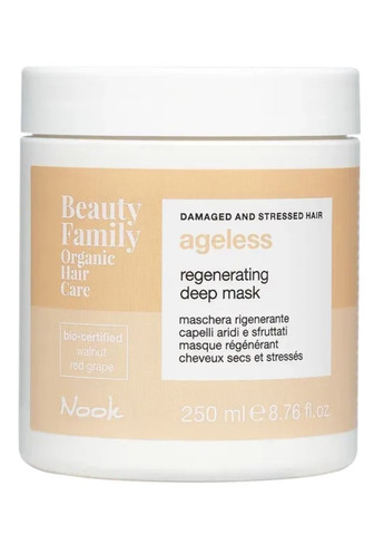 NOOK BEAUTY FAMILY AGELESS Regenerating Deep Mask – это маска глубокого действия с богатой кремовой текстурой, которая интенсивно питает и восстанавливает поврежденные и ослабленные волосы, делая их мягкими, эластичными и плотными. Идеальна для очень сухих, пористых волос. Основные преимущества: Глубоко питает и восстанавливает структуру поврежденных волос. Придает мягкость, плотность и блеск. Улучшает эластичность и защищает от ломкости. Восстанавливает природный баланс увлажнения. Защищает волосы от негативных факторов окружающей среды. Активные компоненты: Масло грецкого ореха – Питает и защищает волосы от свободных радикалов, улучшает эластичность и блеск. Биосжиженный красный виноград – Насыщает волосы полезными веществами, укрепляет структуру, предотвращает старение. Аромат: Нежный, с легкими ореховыми и виноградными нотками. Для кого этот продукт: Для обладателей сухих, поврежденных и ослабленных волос, нуждающихся в интенсивном восстановлении. Результат: Мягкие, плотные, эластичные волосы с природным блеском и защитой от ломкости.