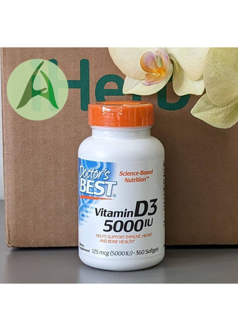 * Science-Based Nutrition| * Помогает поддерживать естественные иммунные реакции, здоровье сердца и костей| * Пищевая добавка| * Без ГМО| * Не содержит глютена| * Не содержит сои| Витамин D3 от Doctor's Best содержит D3 (в виде холекальциферола), необходимый организму для регулирования уровня фосфора и кальция, способствующих здоровью костей, зубов и сердца. Витамин D3 вырабатывается в коже за счет поглощения солнечных УФ-лучей и в ограниченных количествах поступает с пищей. Защита от солнца и климатические факторы могут влиять на низкий уровень витамина D3. Витамин D3 полезен для иммунной и сердечно-сосудистой систем, плотности и структуры костей, а также функционирования клеток. Он играет важную роль в работе большинства органов и систем организма и влияет на химические посредники иммунной системы.| * Помогает регулировать количество кальция и фосфора, необходимых для здоровья костей и зубов.| * Способствует укреплению иммунной системы и сердца.| | РЕКОМЕНДАЦИИ ПО ПРИМЕНЕНИЮ| Взрослым принимать по 1 капсуле в день во время еды или в соответствии с рекомендациями врача-диетолога.| | ИНГРЕДИЕНТЫ| Оливковое масло холодного отжима, оболочка капсулы (бычий желатин, глицерин, очищенная вода).| | ПРЕДУПРЕЖДЕНИЯ| Хранить в сухом и прохладном месте.| | Пищевая ценность| Размер порции: 1 капсула| Порций в упаковке: 360| Количество в 1 порции % от суточной нормы| Витамин D3 (в виде холекальциферола) 125 мкг (5000 МЕ) 625%