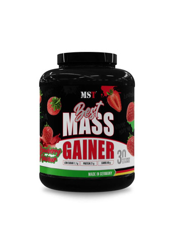 Гейнер Best Mass Gainer MST клубника 3000 г Гейнер Best Mass Gainer от MST — это идеальный продукт для людей, желающих быстро увеличить массу тела. Благодаря высокому содержанию калорий и белка, этот гейнер помогает быстро восстанавливать энергетические запасы после тяжелых тренировок, способствуя росту мышечной массы. Продукт содержит углеводы, белки и другие важные питательные вещества, обеспечивающие организм необходимой энергией для эффективной тренировки и развития мышц. Основные преимущества: Повышенное содержание калорий и белка для быстрого набора массы. Идеально подходит для восстановления после тренировок и для массового набора. Содержит углеводы, которые помогают восстановить энергетические запасы организма. Вкусный вкус клубники, что делает продукт приятным для употребления. Рекомендации по использованию: Смешать 100 г порошка с 300 мл воды или молока. Употреблять после тренировки или между приемами пищи для поддержки набора мышечной массы и обеспечения организма необходимыми питательными веществами. Состав на 100 г порцию: Калории: 377 ккал Жиры: 3,3 г из них насыщеных: 1,6 г Углеводы: 66 г из них сахара: 1,1 г Белки: 21 г Соль: 0,14 г Ингредиенты: Мальтодекстрин, восковая кукуруза, концентрат сывороточного протеина (из молока), овсяная мука, ароматизатор, краситель, эмульгатор (лецитин), подсластитель (сукралоза). Предостережение: Не превышать рекомендуемую дозу. Перед применением обратитесь к врачу, особенно если у вас есть медицинские показания или вы принимаете другие препараты. Хранить в недоступном для детей месте. Почему стоит выбрать Best Mass Gainer? Этот гейнер является отличным выбором для людей, желающих набрать массу и быстро восстановиться после интенсивных тренировок. Высокое содержание белка и углеводов обеспечит вас необходимой энергией для тренировок и развития мышц, а приятный вкус клубники сделает процесс приема добавки еще приятнее.