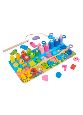 Развивающая деревянная игрушка сортер РазвивающаяУчебная дощечка с Магнитной Рыбалкой - Сортер Монтессори 4в1 - многофункциональный математический сортер , содержащая цифры, математические знаки, деревянные кольца, геометрические фигуры и 10 рыбок для магнитной рыбалки. Игра отлично подойдет для первого знакомства малыша с цифрами и азами счета. Учебные элементы сгруппированы цветовыми блоками – всего 10 блоков разного цвета. Это отличный тренажер для обучения малышу цветов. Эта многофункциональная модель непременно разовьет у малышей мелкую моторику ручек, логическое мышление, а также потренирует координацию движений и усидчивость. Учебный игровой планшет насчитывает ряд увлекательных и развивающих игр: - колышки с кольцами для счета; - математический сортер; - магнитная рыбалка; - геометрический сортер. Отправим по всей Украине оптом и в розницу