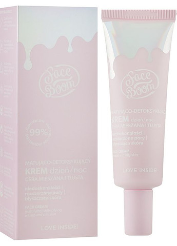 Матирующий и увлажняющий крем с блюр-эффектом из линии FaceBoom Boombastic Lab создан для жирной и комбинированной кожи с наклонностью к образованию угрей. Благодаря веганским ингредиентам и микрокапсулированной формуле придает коже атласный финиш и ровную текстуру. Особенности матирующих и увлажняющих кремов с блюр-эффектом FaceBoom Boombastic Lab: - матирует, тонизирует и разглаживает кожу, одновременно увлажняя и успокаивая ее; - экстракт цветка персика осветляет, восстанавливает, успокаивает кожу; - содержит масло тамана, которое восстанавливает гидролипидный барьер и предотвращает потерю воды; - тонизирующие микрокапсулы придают коже гладкость и атласность, матируют кожу; – ниацинамид помогает бороться с несовершенствами, значительно выравнивает тон кожи; - цинк pca уменьшает видимость расширенных пор и оказывает себорегулюючу действие.