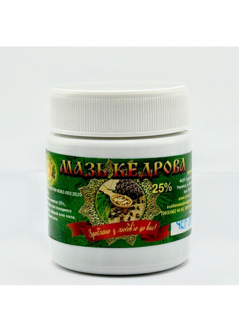 Мазь «Кедровая живица» - лечебное средство, оказывающее активное противовоспалительное, противомикробное, ранозаживляющее, противозудное действие. В составе мази содержатся только натуральные ингредиенты. Мазь можно использовать для массажа (в том числе при усталости ног), согревающих повязки. Она глубоко проникает в подкожную ткань, препятствует развитию опухолей и тормозит рост уже появившихся, применяется при мастопатии. Такое сочетание лечебных компонентов давно известно в народе и используется для очищения и заживления различных ран, применяется при порезах, кровоподтеках, потертостях и отеках. Живица обладает отличным защитным и обезболивающим эффектом при различных ушибах, вывихах, бытовых и спортивных травмах, хронических воспалениях суставов. Мазь уничтожает вредную микрофлору, улучшает капиллярное кровоснабжение кожи, восстанавливает упругость, уменьшает и тормозит развитие морщин. Живица эффективна при псориазе в комплексной терапии. Стимулирует иммунитет, нормализует работу нервной системы, противодействует стрессам. Используется при папилломах, трофических язвах, ожогах, фурункулах, предотвращает обморожение, пролежни, гангрени. Живица поможет при: свежеполученных ранах, потертостях, порезах, отеках; бытовых и спортивных травмах, ударах, вывихах, хронические и травматические воспаления в суставах; гнойно-воспалительных процессах на коже; пеленочной сыпи, опрелости; невралгиях, миозитах; риниты в составе комплексной терапии; укусах насекомых, чесотки, грибковых поражениях, герпесных высыпаниях; предупредит и ликвидирует опрелость, пеленчатую сыпь, геморрой, эрозию, мастит, трещины сосков, пересыхание слизистой носа у курильщиков, при простудных и инфекционных заболеваниях, воспалениях легких, бронхитах, ринитах, гайморите, синусите. Состав: кедровая живица 25%, оливковое масло холодного отжима, пчелиный воск. Способ применения: 1 вариант: на поврежденную чистую поверхность нанести мазь и зафиксировать повязкой. 2 вариант: на поврежденную очищенную поверхность нанести мазь и сверху приложить ошпаренный кипятком капустный лист, зафиксировать повязкой. Повязку менять утром и вечером. При укусах насекомых наносить мазь на пораженные участки тела с растиранием, 2-3 раза в день. От укусов насекомых: растереть кедровую мазь на все тело с растиранием. Продолжительность эффекта 10-12 часов. При простудных и инфекционных заболеваниях: наносить мазь тонким слоем до 5 раз в течение дня, легко втирая в области грудины, легких, горла, переносицы, носа, можно под согревающую повязку (при температуре область груди и спины растирать не рекомендуется). Для защиты от вирусной инфекции и пересыхания слизистой: ежедневно смазывать утром и вечером слизистую носа, можно использовать для профилактических ингаляций; при пеленочных высыпаниях, опрелости, грибковых поражениях наносить тонким слоем 3-5 раза в течение дня на чистые и просушенные участки кожи. Кедровая мазь применяется при заболеваниях опорно-двигательного аппарата. Нанести мазь с растиранием и утеплить проблемную область. ПРИМЕНЕНИЕ ПРИ БЕРЕМЕННОСТИ И КОРМЛЕНИИ ГРУДЬЮ Живицу можно применять при беременности и лактации по показаниям, при отсутствии аллергии на компоненты мази. Противопоказания: Живица противопоказана при индивидуальной чувствительност