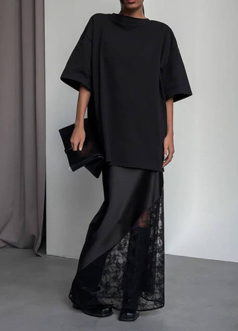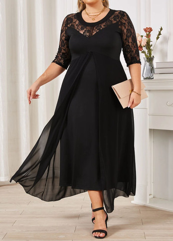 Платье женское длинное с вшитой шифоновой юбкой-накидкой в чёрном цвете — это элегантное сочетание изысканности и лёгкости. А-силуэт подчёркивает фигуру, а кружевной декор придаёт образу особую женственность. Рукава длиной три четверти добавляют изящности, а шифоновая юбка-накидка создаёт воздушный и плавный силуэт при движении.