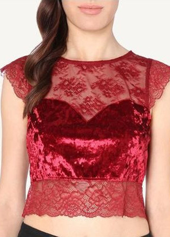 Укороченный топ из матового бархата и эластичного кружева. Детали из прозрачного кружева на вырезе спереди и сзади, а также кружевные рукава.