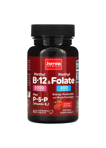 + P-5-P (B6) Пищевая добавка Подходит для веганов Не содержит ГМО Содержит: Метил B-12 - 5000 мкг Метил фолат - 800 мкг Таблетки для рассасывания с метил В12 метилфолатом плюс пироксидал-5 фосфатом (P5P) от Jarrow Formulas сочетают в себе активные формы этих витаминов для поддержки синтеза ДНК и нейромедиаторов и метаболизма аминокислот. Гомоцистеин превращается в метионин посредством метилфолата и В12, а также в цистеин посредством р5р-зависимых энхимов. Рекомендации по применению Растворите во рту или разжуйте 1 пастилку в день или следуйте указаниям своего лечащего врача. Другие ингредиенты Ксилит, целлюлоза, стеариновая кислота (растительный источник), натуральный вишневый ароматизатор, лимонная кислота, экстракт органической ребяки (стевии) и стеарат магния (растительный источник). Ни пшеницы, ни клейковины, ни соевых бобов, ни молочных продуктов, ни яйца, ни рыбы / моллюсков, ни орехов, ни орехов. Подходит вегетарианцам / веганам. Предупреждения Лицам, не достигшим 18 лет, а также при наличии проблем со здоровьем, беременности, лактации, попытках забеременеть, приеме каких-либо медицинских препаратов перед применением этого продукта следует проконсультироваться с врачом. Хранить в недоступном для детей месте. Состав Размер порции: 1 ромб Порций в упаковке: 60 Количество на порцию % от суточной потребности* Витамин В6 (в виде пиридоксаль-5-фосфата) 2,5 мг 125% Фолат (как кватрифолический (6S) -5-метилтетрагидрофолиевой кислоты) 800 мкг 200% Витамин В12 (в виде метилкобаламина) 5000 мкг 83330%