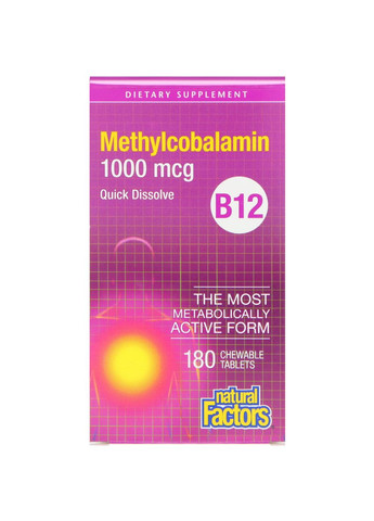 Витамин B12 в форме метилкобаламина от Natural Factors - это активная, биодоступная форма витамина B12, которая поддерживает здоровье нервной системы, способствует нормальному кроветворению и участвует в синтезе ДНК. Этот витамин необходим для преобразования жиров и белков в энергию, а также для обмена гомоцистеина - аминокислоты, избыток которой связывают с рисками для сердца. Метилкобаламин является коферментной формой B12, которая сразу активна после всасывания, без необходимости дополнительных преобразований, как в случае с цианокобаламином. Он особенно эффективен для поддержания когнитивных функций, повышения концентрации и сохранения хорошего настроения, ведь участвует в синтезе нейромедиаторов, таких как серотонин. Добавка рекомендована при дефиците витамина B12, который часто возникает у вегетарианцев, людей с заболеваниями ЖКТ или при длительном приеме некоторых лекарств. Низкий уровень B12 может приводить к макроцитозу (аномально большим клеткам крови), анемии, повышенной усталости, раздражительности, покалыванию в конечностях и даже нарушениям памяти. Форма в виде жевательных таблеток под язык обеспечивает быстрое усвоение и удобна в ежедневном использовании. Рекомендации по применению Разжевывайте и рассасывайте 1 таблетку под языком перед глотанием один раз в день или по указанию врача. Сведения о добавке Размер порции: 1 таблетка Состав порции % от суточной нормы Витамин B12 (метилкобаламин) 1000 мкг 41 667 % Ингредиенты Лактоза, микрокристаллическая целлюлоза, кроскармеллоза натрия, стеарат магния (растительного происхождения). Содержит молоко. Не содержит искусственных красителей, консервантов и подсластителей, крахмала, пшеницы, глютена, дрожжей, сои, кукурузы, яиц, рыбы, моллюсков, соли, древесных орехов или ГМО. Предупреждение Перед принятием пищевых добавок во время беременности, в период кормления грудью, при употреблении медицинских препаратов или наличии каких-либо заболеваний следует проконсультироваться с врачом. Если возникают побочные реакции, прекратите использование и обратитесь к врачу. Храните продукт в недоступном для детей месте. Не используйте, если внешняя защитная мембрана отсутствует или повреждена. Производитель оставляет за собой право изменить внешний вид упаковки. Мы стараемся следить за изменениями, однако, если вы обнаружили какое-либо расхождение, пожалуйста, сообщите нам об этом в письменном виде или в комментариях к товару. Напоминаем! Пищевые добавки не являются лекарственными средствами!