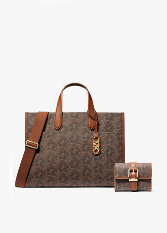 Женский комплект Michael Kors сумка тоут и кошелек. Стильная сумка тоут Michael Kors. Эта большая сумка станет идеальным спутником в путешествии. Поделитесь своей элегантностью и носите с собой роскошную объемную сумку от Michael Kors. Одно просторное отделение без застежки. Внутри три кармана, один из которых на молнии. На лицевой стороне сумки есть большой карман на магните. Плоское дно для удобства. Сумку можно носить  в руке, на плече и через плечо. Двойные ручки и широкий регулируемый ремень, который пристегивается с помощью карабина. Принт в виде монограммы бренда по всей поверхности сумки. Есть брелок с монограммой бренда. Стильный кошелек Michael Kors. Небольшой кошелек от Michael Kors изготовленный из экокожи. Застегивается на кнопку. Внутри одно отделение для купюр и пять слотов для банковских карт. Спереди под клапаном отделение на молнии для монет. Лицевая сторона украшена декоративным ремешком и принтом в виде логотипа бренда. Размер кошелька: 10,5х8,5х2,5 см.