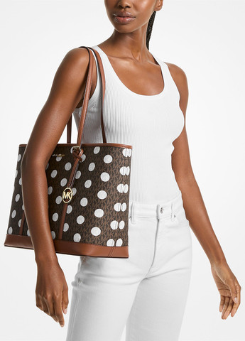 Женская сумка тоут Michael Kors. Вместительная и очень удобная сумка тоут, которая мгновенно украсит ваш повседневный образ. Изготовлена из экокожи с принтом в виде гороха и монограммы бренда. В ней достаточно места для хранения всего необходимого — на каждый день или в поездке. Две ручки, позволяющие носить сумку как в руке, так и на плече. Застежка - молния. Внутри одно основное отделение с карманом на молнии. Съемный брелок с логотипом бренда. Спереди металлический логотип бренда. Отличное качество. Размер: 35,5*29*16 см.