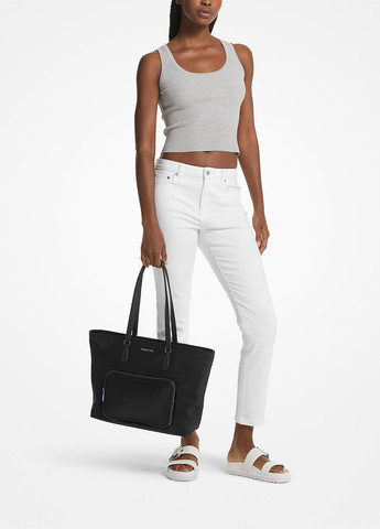 Стильная сумка тоут Michael Kors. Cумка-тоут Cara — стильное решение для ежедневных поездок на работу и дальних перелетов. Она сделана из нейлона и открывается в полностью подшитое внутреннее отделение, которое по размеру подходит для безопасного хранения вашего 13-дюймового ноутбука и запасной пары балеток. Положите важные вещи, такие как ключи, телефон и кошелек во внешнее отделение на молнии и носите его за структурированные верхние ручки. Сумку можно носить как в руке, так и на плече. Застежка - молния. В основном отделении, есть 4 накладных кармана, один на молинии.  Двойные плечевые лямки. Фирменная фурнитура с логотипом спереди. Используйте накладной карман на молнии спереди для вещей первой необходимости. Отличное качество. Размер: 41*32*13 см.