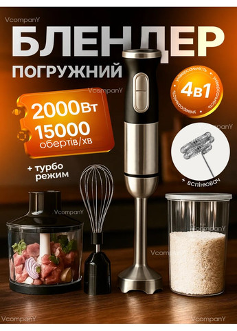 Погружной блендер 5в1 с чашей 600мл, 1500W, VOLYX VO7319 Преимущества: Легкая очистка Удобное управление Компактный дизайн Острые ножи из качественной стали Насадка венчик в комплекте Многофункциональность 5 в 1 Описание: Погружной VOL7 кухонный прибор, который станет незаменимым в вашем кулинарном арсенале. Благодаря мощности в 1500 Вт, он позволяет эффективно обрабатывать продукты, включая измельчение, взбивание и смешивание. Устройство имеет чашу объемом 600 мл, идеально подходящую для приготовления соусов, смузи или детского питания. Комплект включает измельчитель для нарезки овощей и фруктов, венчик для взбивания сливок или белков, а также дополнительные насадки для расширения функциональности. Эргономичная ручка обеспечивает комфорт и безопасность использования, а простая система управления делает работу с блендером легкой и понятной. Прочный корпус и качественные материалы гарантируют долговечность прибора. Характеристики: Тип: миксер блендер Цвет корпуса: черный Материал корпуса: пластик Погружная часть и лезвия: нержавеющая сталь Тип блендера: погружной Мощность: 1500 Вт Питание: сеть 220В Объем: 600 мл Защита от перегрева VO7319 Чаша Стакан Насадка-миксер Вспенитель молока Инструкция Упаковка