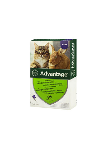 Адвантейдж 80 спот-он – это эктопаразитициды наружного применения. Имидаклоприд - эктопаразитицид, принадлежащий к группе хлорникотиниловых соединений. Имидаклоприд присоединяется к ацетилхолиновым никотиновым (холинергическим) рецепторам блохи, размещенным на постсинаптическом нейроне, прерывает передачу нервного импульса, что в дальнейшем приводит к параличу и гибели паразита. Не влияет на центральную нервную систему млекопитающих. Состав В 1 мл препарата содержится действующее вещество имидаклоприд – 100 мг. Показания к использованию Для профилактики и лечения инвазии блох Ctenocephalides felis у кошек и декоративных кроликов, а также для лечения аллергического блошиного дерматита. Одна обработка защищает животное от повторной инвазии в течение 4-х недель. способ применения и дозы Для животных весом до 4 кг применять Адвантейдж 40 (0,4 мл), более 4 кг – Адвантейдж 80 (0,8 мл). Повторная инвазия блохами из внешней среды возможна через 6 недель и более после обработки. Дополнительно рекомендуется обработка окружающей среды для уничтожения взрослых и личиночных стадий блох. Препарат остается эффективным при намокании животного, однако в таком случае возможна потребность в дополнительной обработке – в зависимости от наличия блох в окружающей среде. В таких случаях не обрабатывайте животное чаще одного раза в неделю. Удалите тюбик из упаковки, держите тюбик в вертикальном положении. Снимите колпачок, переверните его и наденьте на пипетку, таким образом притворив фольгу. Разделите шерсть на шее у животного на основе черепа так, чтобы была видна кожа. Разместите кончик пипетки на кожу, крепко сожмите пипетку несколько раз, чтобы все содержимое нанести непосредственно на кожу. Наносить только на невредимую кожу. Не допускать только что обработанных животных вылизывать друг друга. Противопоказания Не использовать для котят до 8-ти недельного возраста. Оговорки При работе с препаратом запрещается курить, принимать пищу. По окончании работы вымыть руки теплой водой с мылом. При попадании препарата на кожу или слизистые немедленно промывать их водой, если раздражение не проходит, обратитесь к врачу. Условия хранения Кроме продуктов питания и кормов при температуре от 5°С до 25°С.