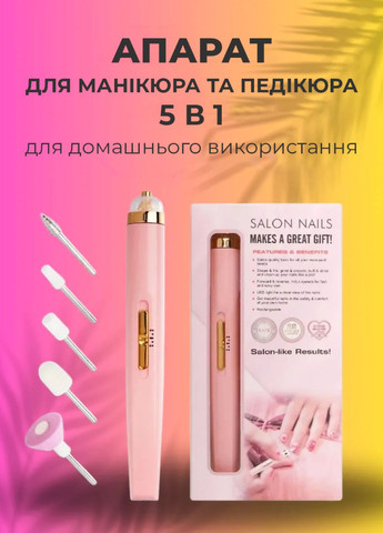 Маникюрный набор Salon Nails сэкономить время и деньги на визиты в маникюрные салоны и без всяческих усилий с вашей стороны, поможет Вам создать ногти совершенной формы. Теперь каждый может себе позволить, сидя дома перед телевизором в любое удобное, уделить время для себя, благодаря этой шлифовальной машинке. Фрезер обладает высокой скорость вращения и достаточной мощностью, как для отделки жестких акриловых ногтей, так и собственных ногтей. В то же время достаточно мягкий для обработки кутикулы и полировки ногтей. 5 насадок в комплекте позволяют делать наиболее распространенные операции. Легко вставляются в аппарат. Область применения Salon Nails: – для обработки края ногтя; – для шлифовки; – для тонкой шлифовки; – для удаления кутикулы; – для удаления мозолей и огрубевшей кожи; – для чистки под ногтями; – для финишной шлифовки. Особенности: Этот набор для домашнего маникюра и педикюра включает в себя 6 насадок, которые помогут: полировать, придавать форму и подпиливать ваши ногти! Перезаряжаемый и беспроводной: это устройство имеет настройки прямого и обратного хода, режимы низкого и высокого энергопотребления, а также светодиодную лампу для подсветки ногтя. Сделайте безопасный и гигиеничный маникюр в безопасности у себя дома Характеристики: Тип устройства: прибор для ухода за ногтями Вид: портативный Цель использования: маникюр, педикюр Кол-во скоростей: 4 Вращение: в обе стороны Зарядка: USB кабель Время подзарядки: около 3 ч Время автономной работы: до 60 мин Подсветка: предусмотрена В комплекте: 5 насадок, кабель зарядки, руководство пользователя Упаковка: коробка