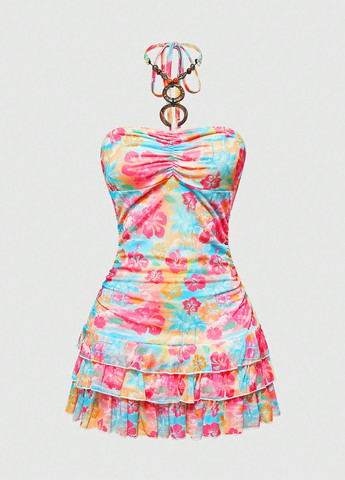 Это мини-платье имеет многослойный ярусный подол и облегающий крой. Вырез халтер, без рукавов. Платье обладает высокой эластичностью для комфорта. Можно стирать в стиральной машине или чистить в химчистке.