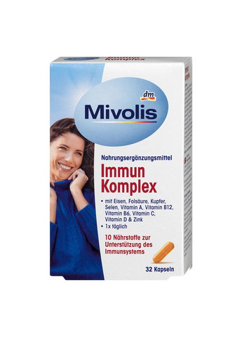 Капсулы Иммунный комплекс, 17 г Mivolis Капсулы Immun Komplex от Mivolis Пищевая добавка с витаминами и минеральными веществами Витамин D и витамин B6 способствуют нормальному функционированию иммунной системы Витамины B6 и B12 и медь способствуют нормальному обмену веществ, важному для выработки энергии. Фолат способствует нормальному образованию крови Капсулы Mivolis Immun Komplex – пищевая добавка с витаминами и минералами. Витамин D и витамин B6 способствуют нормальному функционированию иммунной системы. Витамин C способствует нормальному функционированию иммунной системы во время интенсивных физических нагрузок и после них, при этом благоприятный эффект витамина C достигается, если до рекомендуемой суточной дозы витамина C, составляющей 80 мг, дополнительно принимать 200 мг. Витамины B6 и B12 и медь способствуют правильному обмену веществ, важному для образования энергии. Железо способствует правильному образованию эритроцитов и гемоглобина, а медь помогает правильному переносу железа в организме, фолаты способствуют правильному образованию крови. Рекомендуется принимать 1 таблетку Mivolis в день. Свойства: Свойства продукта:без лактозы, не содержит глютена Важные примечания: Нельзя превышать установленную рекомендуемую суточную дозу. Пищевые добавки не могут быть использованы в качестве заменителя сбалансированного и разнообразного питания и здорового образа жизни. Не подходит для детей и подростков младше 18 лет. Хранить в недоступном для детей месте. Не использовать одновременно с другими пищевыми добавками, содержащими цинк. Мужчинам, женщинам после менопаузы и беременным женщинам перед употреблением железа следует проконсультироваться с врачом. Во время беременности пищевые добавки с витамином А следует использовать только после консультации с врачом. Состав: L-аскорбиновая кислота (витамин С), желатин, основной компонент: фосфат кальция, сульфат железа, антислеживающие вещества магниевые соли жирных кислот и оксид кремния, оксид цинка, сульфат меди, пиридоксин гидрохлорид (витамин B6), ретинилацетат (оимин А) натрия, холекальциферол (витамин D3), цианокобаламин (витамин B12), краситель: оксид железа