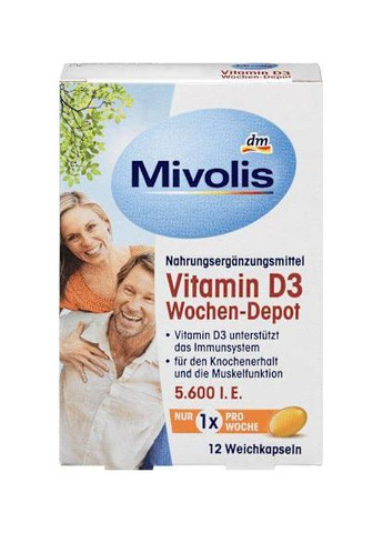 Описание продукта Витамин D3 поддерживает иммунную систему Для поддержания костей и функции мышц Только 1 раз в неделю Витамин D также известен как солнечный витамин. Хотя организм может производить витамин D самостоятельно с помощью солнечного света, достаточное его поступление не всегда гарантировано в течение длительных периодов отсутствия солнечного света, особенно в темные месяцы года и во время пребывания в помещении. Еженедельное депо витамина D3 от Mivolis использует способность организма сохранять витамин D. Всего одна капсула в неделю может покрыть ваши потребности в витамине D в течение недели. Еженедельный прием витамина D обеспечивает ежедневное поступление этого витамина, поскольку он может храниться в организме и высвобождаться в любое время, когда это необходимо. Витамин D – это многогранный витамин, участвующий в многочисленных процессах в организме. Он поддерживает обычную функцию иммунной системы. Он также способствует поддержанию нормальной функции мышц, а также костей и зубов. Он также играет определенную роль в разделении клеток. Складывание За суточную дозу* % NRV** Витамин D 20 Ã г 400 %