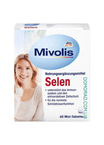 Срок годности Неограниченный Вес/объем 60 gr Количество штук в ящике 5 Mivolis Selen Эти витамины Mivolis содержат микроэлемент селена, который поддерживает иммунную систему и антиоксидативную защиту клеток. Он играет немаловажную роль в нормальной работе щитовидной железы. Это также помогает поддерживать нормальные волосы и ногти. Человеческий организм не может сам производить селен. Поэтому его следует принимать регулярно из-за еды и витаминов. 60 таблеток Количество штук в ящике: 5 *На Domorad com ua бытовая химия из Германии реализуется как поштучно, так и ящиками