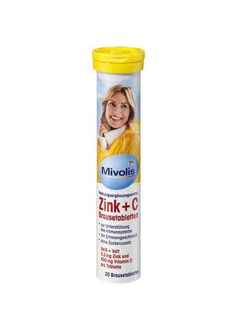 Mivolis Zink+C Mivolis Витамины Цинк + витамин С Для поддержания иммунной системы С ароматом лимона Без добавленного сахара Шипучие таблетки Mivolis Zink+C имеют освежающий вкус лимона. Цинк является важнейшим микроэлементом и поддерживает нормальную функцию иммунной системы с витамином С. Рекомендуемая дозировка: Растворяйте 1 шипучую таблетку ежедневно в стакане воды (примерно 150 мл). Вы можете приготовить напиток горячей (не кипящей) или холодной водой. 20 шипучих таблеток