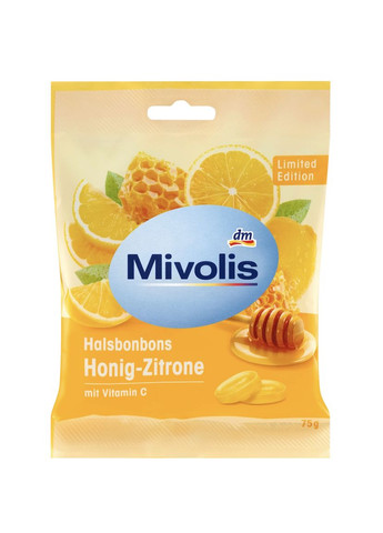 Описание продукта Пастилки для горла Мед-лимон С витамином С Без глютена и лактозы Пастилки для горла Mivolis Мед-лимон с витамином С сочетают сладость меда и освежающую кислинку лимона. Их тщательно сбалансированный рецепт обеспечивает успокаивающий эффект и балует горло. Всего две пастилки в день способствуют нормальной работе иммунной системы благодаря содержанию витамина С. Состав: сахар, глюкозный сироп, мед (6,8%), подкислитель: лимонная кислота; концентрат лимонного сока (0,4%), натуральный аромат цитрусовых, экстракт корня куркумы, натуральный аромат, витамин С.