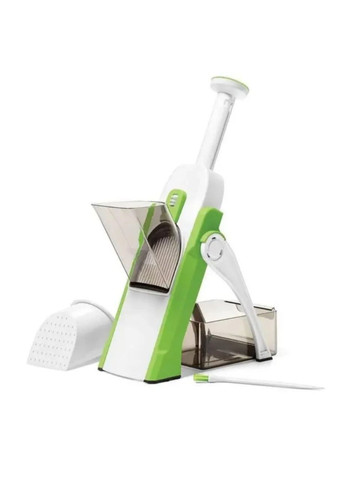 Этот многофункциональный слайсер обладает 24 вариантами измельчения продуктов. Мультислайсеру по силам порезать овощи и фрукты кубиками, кружочками, соломкой, брусочками разной толщины и длины. Мультислайсер Safe slice mandoline представляет собой многофункциональное полуавтоматическое устройство со встроенной системой лезвий из нержавеющей стали для нарезки самых разнообразных овощей и фруктов. Главным преимуществом устройства является инновационный пружинный механизм, обеспечивающий быструю и легкую обработку продуктов: опускаете ручку, острое лезвие разрезает продукт, пружина мгновенно возвращает ручку в исходное положение. В процессе нарезки не нужно прилагать дополнительных физических усилий. На корпусе мультислайсера расположены два рычага для выбора типа резьбы и для настройки толщины от 0.5 мм до 8 мм (шаг составляет 0.2 мм). Блюда получатся не только вкусными, но красиво оформленными. Преимущества: ● В качестве основного материала – надежный пластик без добавления вредного бисфенола А; ● Мультислайсер и комплектующие подходят для мойки в посудомоечной машине; ● Быстрая нарезка без усилий – благодаря уникальной пружинной системе ручка после нажатия мгновенно поднимается вверх, не требуя расходов; ● Многофункциональное и универсальное устройство – нарезка продуктов кубиками, кружочками, соломкой, брусочками разной толщины и длины; ● Абсолютная безопасность конструкции; ● Встроенная режущая система содержит три высококачественных лезвия из нержавеющей стали, которые никогда не затупляются; ● Отличный результат нарезки – каждый раз у вас будут выходить идеально ровные кусочки; ● Компактный дизайн для хранения; ● Устойчивость за счет резиновых ножек и уникальной конструкции под «пирамиду»; ● Два рычага для выбора типа нарезки и для настройки толщины от 0,5 мм до 8 мм (шаг составляет 0,2 мм).