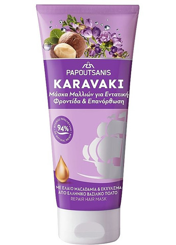 Когда волосы устали от постоянного воздействия окружающей среды, стайлеров, средств для фиксации укладок и жесткой проточной воды, необходимо восстановить запас питательных веществ. Это поможет вернуть упругость, шелковистость и здоровый вид волос. Именно для этого бренд Papoutsanis Karavaki разработал Repair Hair Mask на основе натуральных масел. Она дарит эффект уже после первого использования, упрощая расчесывание и делая волосы более послушными. Активные компоненты формулы защищают от ломкости и появления секущихся кончиков, заполняя пробелы и пустоты. Маска имеет приятную консистенцию, потому легко наносится по всей длине. Особенности Repair Hair Mask от Papoutsanis Karavaki: - на 94% состоит из натуральных компонентов; - быстро восстановит сухие и поврежденные волосы; - делает пряди гладкими, упругими и шелковистыми; - натуральный кератин в составе заполняет пустоты в структуре волос. Делает его эластичным и предотвращает ломкость; масло семян макадамии увлажняет, питает и возвращает здоровый блеск; экстракт греческого маточного молочка возвращает шелковистость и упрощает процесс расчесывания; имеет приятный аромат и дарит ощущение свежести.