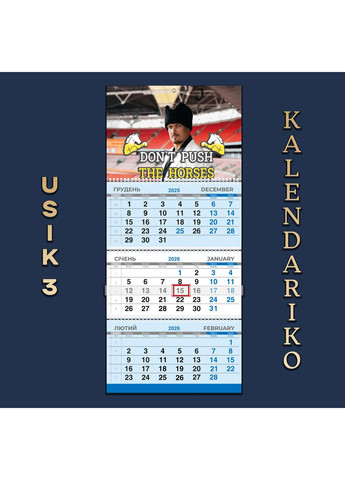 Квартальный календарь "Александр Усик" на 2026 год - это вдохновение, сила и настойчивость чемпиона. Календарь с яркими изображениями легендарного украинского боксера Александра Усика станет символом воли к победе и отличным стимулом в повседневной жизни. Он будет не только практичным инструментом для планирования, но и настоящим мотиватором. Характеристики: Вид: квартальный, на 3 пружины; Размер: 297*675мм; Блок: 3 блока по 12 листов, 297х140 мм, мелованная матовая бумага 115г/м2; Крепление: отверстие с металлическим люверсом; Дизайн: фотографии и художественные изображения Александра Усика; Языки: двуязычный (украинский и английский). Календарь будет напоминать вам о силе духа, дисциплине и стремлении к вершинам, помогая ежедневно достигать своих целей.