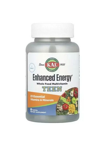 Энергия! Цельный пищевой продукт Мультивитамины для потрясающей концентрации С 1932 года Новаторское качество Пищевая добавка 1 раз в день Явное качество 3 порции фруктов и овощей‡ 32 экоганических продукта Описание: Сбалансированное питание для всего организма с удобной в применении таблеткой для приема один раз в день с покрытием AromaSmooth, обладающим свежим мятным вкусом. Вегетарианская формула Enhanced Energy для подростков содержит витамины, минералы и пищевые катализаторы, плюс эквиваленты 3 порций фруктов и овощей‡, а также экоганическую смесь для энергии, улучшения состояния кожи и крепкого иммунитета. Эксклюзивная смесь для максимальной концентрации предназначена для питательной поддержки памяти и концентрации. ‡На основании содержания антиоксидантов (по значению ORAC) Рекомендации по Применению Применять только согласно указаниям. Принимайте по 1 вегетарианской таблетке в день вместе с пищей или стаканом воды. Технология ActivTab гарантирует растворение в течение 30 минут согласно стандартам USP. Другие Ингредиенты Целлюлоза, мальтодекстрин, стеариновая кислота, альгинат натрия, гороховый крахмал, стеарат магния, аравийская камедь, кремнезем и масло перечной мяты. KAL Гарантирует, что к этому продукту добавлены НИОК, отличные от тех, которые указаны на этой этикетке. Предупреждения Не использовать при отсутствии или повреждении верхнего слоя упаковки. Хранить в недоступном для детей месте. Поставьте в известность своего врача о том, что вы принимаете этот продукт. Случайная передозировка железосодержащими препаратами является основной причиной отравлений с летальным исходом у детей до шести лет. При случайной передозировке немедленно обратитесь к врачу или в токсикологический центр. Хранить в сухом прохладном месте. Состав Размер порции: 1 Вегетарианская таблетка Количество на порцию % от суточной потребности Витамин А (как 100% натуральный бета-каротин) 5000 МЕ 100% Витамин C (как аскорбиновая кислота) 200 мг 333% Витамин D (как холекальциферол) (D-3) 1000 МЕ 250% Витамин Е (как природный источник d-альфа-токоферил сукцинат) 50 МЕ 167% Витамин К (как Менахинон-7 из Натто) (К-2) 10 мкг 13% Тиамин (в виде HCl, Cocarboxylase) (B-1) 10 мг 666% Рибофлавин (как рибофлавин, рибофлавин-5-фосфат) (B-2) 10 мг 588% Ниацин (как ниацинамид) (B-3) 30 мг 150% Витамин B-6 (как пиридоксин HCl, пиридоксаль-5-фосфат) 10 мг 500% Фолат (как фолиевая кислота) 400 мкг 100% Витамин B12 (как метилкобаламин, цианокобаламин) 250 мкг 4166% биотин 100 мкг 33% Пантотеновая кислота (как пантотенат кальция) 10 мг 100% Кальций (в виде карбоната) 100 мг 10% Железо (в виде черных фумаратов) 9 мг 50% Йод (из органических водорослей) 75 мкг 50% Магний (в виде оксида) 50 мг 13% Цинк (как цитрат) 20 мг 133% Селен (как селенометионин) 100 мкг 143% Медь (как аминокислотная кислота) 1 мг 50% Марганец (как аминокислотный хелат) 1 мг 50% Хром (в виде Arginate) 100 мкг 83% Калий (как цитрат) 25 мг <1% Choline Bitartrate 25 мг * инозит 25 мг * Комплекс цитрусовых биофлавоноидов (предоставление биофлавоноидов апельсина, лимона и грейпфрута) 50 мг * Hesperidin 1 мг * Пребывание Sharp Blend Экстракт виноградных косточек (содержащий натуральные полифенолы и процианидины), ГАМК (гамма-амино-масляная кислота), концентрат фосфатидилсерина (поставляет 10 мг фосфатидилсерина) (соевый) и DMAE (диметиламиноэтанол битартрат) 75 мг * Экоганические травы и суперпродукты Органическая спирулина (цельная), Органический элеутеро (корень), О