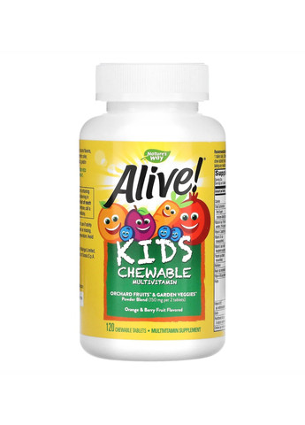 Порошковые смеси Orchard Fruits™ и Garden Veggies™ (150 мг в 2 таблетках) Мультивитаминная добавка Уникально сбалансированный продукт для поддержания роста и развития Мультивитамины с высокоэффективными витаминами C, D и B. Содержит цитрусовые биофлавоноиды и высокоэффективные смеси Orchard Fruits™ и Garden Veggies™. Веселые и вкусные с ароматом апельсина, ягод и фруктов. Разработанная специально для детей, эта добавка содержит высокоэффективные витамины группы B, включая активную форму витамина B12 и фолат. Для здоровья: бета-каротин (витамин A), витамин C, витамин E, цинк. Для здоровья костей: кальций, фолат, марганец, витамин D3. Для выработки энергии на клеточном уровне: витамины группы B, биотин. Для здоровой иммунной системы: цинк, витамины A, C и D3. Мультивитамины Alive!® созданы для обеспечения вас энергией для всех важных дел. Получите максимальную пользу от мультивитаминной добавки, включающей эффективные витамины, микроэлементы и пищевые смеси, придающие бодрости на каждый день! Рекомендации по применению Не предназначено для детей младше 2 лет из-за опасности удушения. Детям в возрасте 2–3 лет принимать по 1 жевательной таблетке каждый день. Детям в возрасте от 4 лет принимать по 2 жевательные таблетки в день. Желательно принимать во время еды. Ребенок должен тщательно разжевать таблетки перед проглатыванием. Другие ингредиенты Фруктоза, сорбитол, натуральные ароматизаторы, стеарат магния, лимонная кислота, куркума (краситель), овощной сок (краситель), яблочная кислота, диоксид кремния. Не содержит глютена, ингредиентов, получаемых из дрожжей, пшеницы, молочных продуктов.