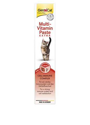 Мультивитаминная паста GimCat Multi-Vitamin благодаря входящим в ее состав 12 - ти жизненноважным витаминам и таурину является незаменимой ежедневной добавкой к питанию Вашей кошки, способствуя ее нормальному развитию, прекрасному внешнему виду и хорошему самочувствию. мультивитаминная паста GimCat Multi-Vitamin способствует повышению естественных защитных свойств организма: - таурин поддерживает остроту зрения и работу сердца; - комплекс добавок привносит в организм ценные питательные и балластные вещества, способствует великолепному состоянию кожного покрова и шерсти