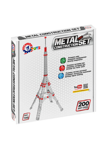 Традиция металлических конструкторов берет свое начало в далеком 18 в. На этих конструкторах возросло множество поколений известных изобретателей, механиков и инженеров. Благодаря игрушкам мальчики (и девочки) приобретают первые навыки соединения деталей винтами, гайками, работы отверткой и ключами. Они создают настоящие "работающие модели": разнообразные автомобили, вертолет, кран, трактор, поезд, внедорожник, танк, мотоцикл и многое другое техники. Работа с конструктором: вызывает у детей интерес к работе машин и механизмов; дает базовые понятия о взаимодействии отдельных элементов; знакомит с техническими названиями деталей, простыми чертежами и схемами; развивает навыки логического мышления, пространственное воображение, внимательность и фантазию. Металлические конструкторы используются на уроках в начальной школе как наборы для конструирования с разными способами соединения (НУШ). Новая методика STEM (Science, Technology, Engineering, Mathematics) активно применяет такие конструкторы в образовательном процессе. Например, можно собрать модель молекулы, цветка, ветряной мельницы или динозавра. Ребёнок не просто знакомится с новыми направлениями развития точных наук и инженерии, а учится реализовывать изученное на практике. Металлические конструкторы ТехноК отличаются высоким качеством и разнообразием деталей, интересным сочетанием металлических и пластиковых запчастей. В каждом наборе есть отвертки и ключи для сборки моделей. Кроме того, малый изобретатель может придумать свои варианты сборки и новые интересные модели. Творческая работа является основой развития креативного мышления ребенка. Игры с конструктором ТехноК принесут много пользы и будут интересны не только малышам, но и взрослым. Металлический конструктор "Эйфелева вежа" (200 деталей) – это модель всемирно известного памятника архитектуры г. Париж, Франция. Особенностью набора есть пластиковые клипсы для фиксации металлических пряностей. Они обеспечивают быстрый и легкий сбор конструтора. Помимо функционала, яркий красный цвет придает красоту собранной модели. Пошаговая цветная инструкция. Упаковка – яркая коробка. Для детей от 5 лет. Производитель: Технок; Возраст: С 5-ти лет; Возрастная группа: От 5 лет; Стать: унисекс; Страна-производитель товара: Украина; Габариты: высота: 18.7; Габариты: длина: 3.5; Габариты: ширина: 19; Страна регистрации бренда: Украина; Вид: конструктор; Материал: Металл, пластик; Тип: Металлический конструктор; Торговая марка: Технок; Цвет: Красный; Размер изделия: 18,7х3,5х19 см; Упаковка: Картонная коробка;