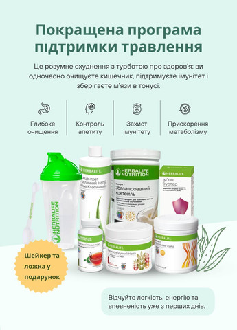 Программа "Первый результат-2" Гербалайф– это идеальный выбор для тех, кто только начинает свой путь к здоровому образу жизни и контролю веса с Herbalife Nutrition. Она разработана для того, чтобы вы могли: Получить первый ощутимый результат в похудении. Познакомиться с продукцией Гербалайф, ее принципами и эффективностью. Определить любимый вкус Протеинового коктейля Формула 1, ведь вкус продуктов вы выбираете при подтверждении заказа нашим консультантом. Сэкономить средства, получая выгодный стартовый набор. ПРЕИМУЩЕСТВА ПРОГРАММЫ: Клиническая эффективность: продукты Herbalife подтверждены исследованиями в области контроля веса, что гарантирует их действенность и надежность. Комфортное снижение веса без голода: благодаря высокому содержанию белка, витаминов и минералов, продукты обеспечивают длительное чувство сытости при контролируемой калорийности, что устраняет изнурительные диеты и голодание. Быстрые и заметные результаты: пользователи могут наблюдать реальное снижение веса уже в первый месяц (от 4-5 кг, в зависимости от программы и индивидуальных особенностей), а при длительном применении - до значительных показателей (до 20 кг и более). Комплексное улучшение пищеварения и очищение организма: компоненты программ, такие как Концентрат Алоэ, эффективно выводят токсины, улучшают работу ЖКТ, нормализуют микрофлору кишечника и помогают устранить вздутие и отеки. Сбалансированное питание: программы обеспечивают организм всеми необходимыми питательными веществами (ценным белком, полезными углеводами, витаминами, минералами, клетчаткой) без лишних калорий, что является основой здорового снижения веса и поддержания организма. Качество и надежность: продукция Herbalife сертифицирована в Украине и одобрена Министерством здравоохранения Украины и институтом экогигиены и токсикологии им. Л. И. Медведева, что подтверждает ее безопасность. Удобство и простота в использовании: приготовление заменителей пищи занимает минимум времени (например, 2 минуты для коктейля), что легко интегрируется в современный ритм жизни. СОСТАВ ПРОГРАММЫ: Растительный концентрат Алоэ Классический (1 шт): Очищает желудочно-кишечный тракт (ЖКТ). Выводит токсины и шлаки из организма. Помогает усвоению воды, поддерживая оптимальный водный баланс. Протеиновый коктейль Формула 1 (2 шт): Всего за 100 ккал (в порции) дает длительное чувство сытости и энергию. Обеспечивает до 30% суточной нормы важнейших витаминов и минералов. РЕКОМЕНДАЦИИ ПО ПРИМЕНЕНИЮ: Как правило, заменяйте два основных приема пищи (чаще всего завтрак и ужин) Протеиновым коктейлем Формула 1. Это обеспечит организм необходимыми питательными веществами при контролируемой калорийности. Один раз в день употребляйте свою обычную, сбалансированную пищу, которая соответствует принципам здорового питания. Между основными приемами пищи делайте легкие и здоровые перекусы (например, фрукты, овощи, кефир, орехи). Регулярно употребляйте Концентрат Алоэ. Растворите рекомендуемое количество (например, 15 мл) в воде и пейте в течение дня. Это способствует очищению ЖКТ, выведению токсинов и улучшению пищеварения.