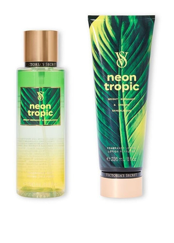 Набор для тела Neon Tropic Victoria’s Secret. Набор состоит из лосьона и миста для тела. Перенеситесь в жаркую летнюю ночь. Пряные фрукты, солнечные цветочные ноты и знойные ароматы кожи продлят вечеринку до рассвета. Ноты: cочный арбуз, цветок тиаре. Тип аромата: цветочный. Лосьон для тела: Увлажняющий лосьон для тела Шелковистая формула лосьона для тела увлажняет кожу, дарит ей мягкость и придает легкий аромат. Увлажнение кожи на 24 часа Объем: 236 мл. Парфюмированный мист: Пробудите свои чувства освежающим парфюмированным мистом. Объем: 250 мл.