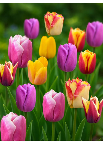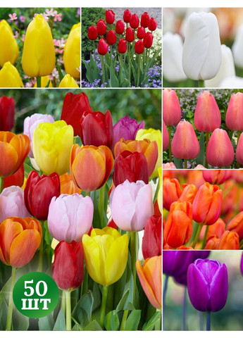 Микс тюльпанов Радуга – настоящий праздник на любом садовом участке – жизнерадостный, веселый, счастливый и просто невероятно впечатляющий. Микс из цветов разных оттенков создает эффект живой картины, которая постоянно меняется в зависимости от угла обзора и освещения. Даже небольшая группа луковиц в таком наборе дарит ощущение разнообразия и жизнерадостности. Особенность этого микса – его универсальность. Он подходит как для центральных клумб, так и для бордюров или высадки вдоль дорожек. Благодаря разным цветам, цветение выглядит динамичным и обильным, даже если высажено лишь несколько десятков луковиц. Такой вариант идеально подходит тем, кто хочет получить яркую картину без сложных подборов сортов. В срезке разноцветные тюльпаны символизируют радость и дружбу. Букет из них выглядит непринужденно и вместе с тем празднично, поэтому станет универсальным подарком для любого случая. Идеальные условия для выращивания: высаживать луковицы тюльпанов лучше всего осенью, ориентировочно это сентябрь – начало октября. Глубина посадки – примерно 15–20 см (от основания луковицы), а для долговечных сортов – до 30 см. Расстояние между растениями – 10–15 см. В каждую лунку следует добавить горсть компоста или специального удобрения для луковиц – это поможет молодым корешкам быстрее прижиться. Сажайте верхушкой вверх, а если не уверены — боком: природа сама разберется. Тюльпаны любят солнце и легкую, хорошо дренированную почву. Хуже всего, что может с ними произойти, это влажный участок: там луковицы быстро загнивают. Поэтому выбирайте место, где не застаивается вода, и где растения получат не менее 6 часов солнца в день. После цветения не спешите обрезать листья – именно они накапливают питательные вещества для новых луковиц. Удалите только цветоносы, чтобы растение не тратило силы на семена. Листья должны созреть в течение 6 недель. Подпитывайте весной или осенью удобрением с низким содержанием азота, компостом или перепревшим навозом – тюльпаны отблагодарят за это щедрым цветением.