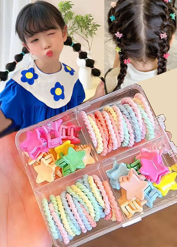Набор резинок и заколочек для волос в коробке из прозрачного пластика веселые резинки и заколки звездочки для локонов ваших малышей. Украшения дарят счастье и незабываемые впечатления, они создадут утро и радугу в пасмурный день. Коробка 7,5х7,5х2,5 см. Заколки 1х1 см