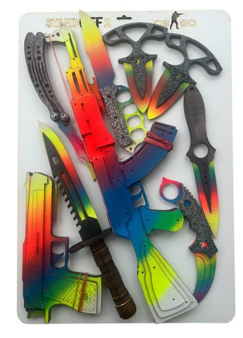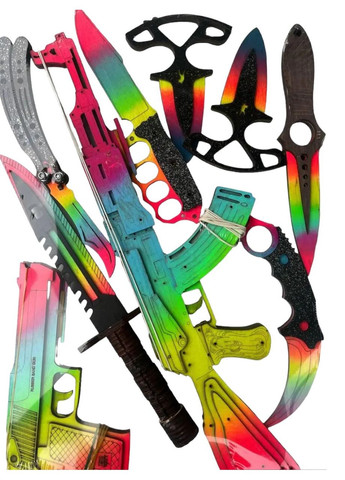 Красивый набор детей для игры. Ножи не заточены, порезаться невозможно. Безопасны для детей. Пистолет и автомат стреляют резинками. Их преимущество – что они автоматически перезаряжаются после выстрела на 4 заряда. Материал из которого они изготовлены – деревянная фанера. В комплект каждой игрушки входит 10 шт. резинок, которые затем можно приобрести в канцелярии. Цена за набор-9 шт. Цвет: Градиент Керамбит – 19 см. Штык Нож – 32.5 см. Тычковый нож 2 шт. – 14.5 см. Нож Бабочка – 25.5 см. Скелетный Нож – 24.5 см. Нож Кастет – 25 см. Пистолет – 23 см. Автомат – 49 см.