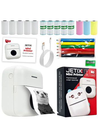 Минитермопринтер JETIX Mini Printer – это не только принтер. Его основные преимущества – мобильность и универсальность. Он легко уместится в сумочке или рюкзаке, позволяя печатать в любых условиях. Что не менее важно, он не требует использования тонеров или чернил, поскольку работает на основе технологии термопечати. Благодаря этому дети могут с удовольствием печатать, где угодно и когда угодно, развивая свои творческие способности в пути, дома или с друзьями. Термопринтер JETIX стимулирует творчество детей, позволяя им создавать собственные проекты, картинки, этикетки и наклейки. Дети могут экспериментировать с разными узорами и формами, развивая свои художественные навыки. А цветные карандаши и наклейки, которые входят в комплект, позволят разнообразить творчество. Принтер предназначен не только для детей, но и для взрослых, он может быть очень полезен в работе, давая печатать краткие заметки, графические изображения и другие материалы в высоком качестве. Это отличный вариант для студентов и людей, работающих в офисе. Особенности: Печать высокого разрешения 204 dpi Можно распечатать фотографии, этикетки, шпаргалки, QR-код и т.д. В приложении есть множество шрифтов и визуальных тем по выбору. Встроенный аккумулятор емкостью 1000 мАч. Принтер легок и компактен, его можно везде брать с собой. Набор цветных карандашей и наклейок в комплекте. Среди дополнительных функций устройства: прямая печать из телефона через FunPrint возможность предварительного просмотра перед печатью сохранения истории печати Приложение FunPrint позволяет создавать персонализированные этикетки, что позволяет пользователям адаптировать их к своим индивидуальным потребностям. Они могут создавать этикетки с текстом, графикой, цветом и формами в соответствии со своими предпочтениями. Делать заметки на небольших листах бумаги может быть очень полезно, особенно если вы хотите быстро записать важную информацию или напоминание. Этикетки в форме наклеек с рисунками могут стать уникальным дополнением к ученической тетради. Технические характеристики: Тип: карманный, портативный Bluetooth-принтер Тип печати: термопечать Цвет печати: черно-белая Расходные материалы: рулонная термобумага Размер бумаги: ширина 57 мм Способ подключения: Bluetooth Совместимость: Android, iOS, HarmonyOS Питание: встроенный аккумулятор 1000м8 мм Комплектация Термопринтер: 1 шт Рулонная термобумага: 1 шт Карандаши цветные: 6 шт Наклейки: 2 шт Зарядный USB-кабель: 1 шт Точилка для карандашей: 1 шт Инструкция пользователя: 1 шт