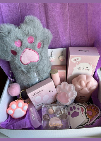 В комплектацию входят: Держатель для телефона, попсокет Лапка -1 шт Косметичка антистресс мягкая-1 шт. Крем для рук детский-1 шт Помада бальзам для губ-1 шт Тени-1 шт Брелок – 1 шт Набор наклеек-50 шт Серьги кавычки-1 шт Такой подарок подойдет на любой праздник, День рождения или Новый год. Ни один любитель аниме просто не сможет остаться безразличным к подарочному набору. Такой подарок порадует как детей, так и взрослых, любящих котик и кавычки.