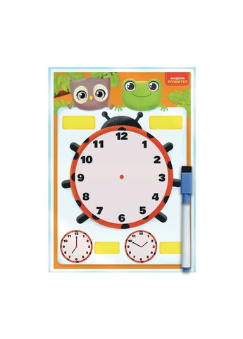 Доска-тренажер Vladi Toys (Влади Тойс) Часы и распорядок дня – увлекательное пособие для изучения времени и составления распорядка дня. Основные преимущества: набор включает двустороннюю доску и многоразовый маркер. одна сторона доски содержит часы для тренировки в определении времени, а другая – расписание и увлекательные задачи маркер легко стирается с поверхности доски специальной губкой, что позволяет не бояться ошибок к задачам можно возвращаться столько раз, сколько нужно для закрепления навыков способствует развитию логического мышления, фантазии, памяти и мелкой моторики Комплектация: Двухсторонняя доска. Многократный маркер. Характеристики Производитель: Vladi Toys, Украина. Рекомендовано для детей от 3 лет.