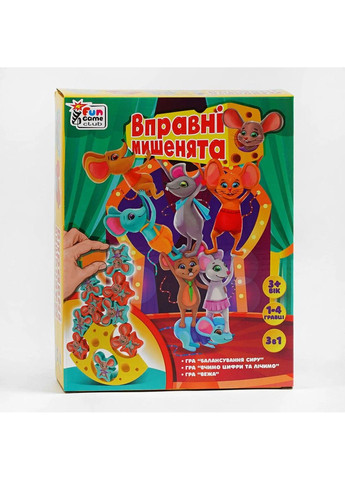 Великолепная развивающая игра “Искусные мышата” от "4FUN Game Club" - залог хорошего настроения малышей. Набор сочетает несколько вариантов игр: “Балансирование сыра”, “Башня” и “Учим цифры и считаем”. Ребенок будет иметь возможность попробовать свои силы в уравновешивании сырного ломтика маленькими мышатами, построить самую высокую башню и изучить цифры, упорядочивая мышок по числовому порядку. Это веселый способ овладеть счетом и научиться выполнять простые математические действия, развить воображение и улучшить зрительно-моторную координацию. Особенности: - 3 варианта игры; - тренировка мелкой моторики и координации движений, изучение цифр и выполнение простых математических упражнений; - количество игроков: 1-4; - возрастная категория – 3+. Комплектация: - “сырная” качели; - 12 пластиковых мышат; - набор наклейок.