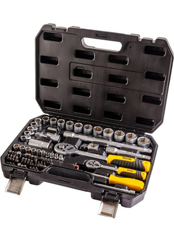 Набор насадок торцевых ТИТУЛ CRV 1/4" и 1/2", 72 шт (78-7072) Набор инструментов ТИТУЛ используется для бытового ремонта и обслуживания авто. В состав набора входит 72 элемента изготовленных из инструментальной стали. Шестигранные торцевые головки 10–27 мм, головки под квадрат 1/4" 4-13 мм, удлинители 125 и 250 мм, кардан, свечные головки 16 и 21 мм, отверточные насадки, шестигранники помогут закрутить и открутить многие элементы в авто. Трещотки с профилем 1/2" и 1/4" имеют шестерни на 24 зуба и обрезиненную ручку с TPR покрытием для удобства использования. Каждый элемент набора имеет антикоррозионное покрытие и находится в отдельной ячейке, так что при хранении и транспортировке все головки и биты останутся целыми и на своем месте. Кейс изготовлен из пластика с усиленными петлями и замками. Особенности: • универсальность использования • инструментальная сталь • комплектность 72 элемента • профиль квадрат 1/2", 1/4" • трещотка 24 зуба • кейс изготовлен из пластика • пластиковые замки защёлки Состав набора: • головки шестигранные 1/2": 10, 11, 12, 13, 14, 15, 16, 17, 18, 19, 20, 21, 22, 23, 24, 27 мм • головки шестигранные 1/4": 4, 5, 5.5, 6, 7, 8, 10, 11, 12, 13 мм • удлинители 1/2": 125, 250 мм • удлинитель 1/4" 100 мм • кардан 1/2" • трещотка 1/2" 24 зуба • трещотка 1/4" 24 зуба • головка свечная 1/2" 21 мм • переходник квадрат 1/4"-шестигранник 1/4" • держатель для бит 1/4" 150 мм • переходник 1/2"M x 3/8"F • ключи шестигранные: 1.5, 2. 2.5 мм • биты отверточные 1/4" 30 мм: - TORX: T8, T10, T15, T20, T25, T27, T30, T40 - HEX: H2, H3, H4, H5, H6, H8, H10 - HEX: H1/8", H9/64", H5/32", H3/16", H7/32", H1/4", H5/16" - PH0, PH1, PH2, PH3 - PZ1, PZ2, PZ3 - SL4, SL5.5, SL7 - Spline 6, Spline 8 Характеристики: Вес:4.343 кг Наличие кейса:да