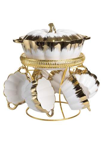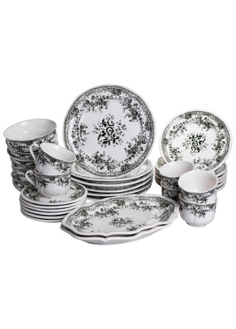 Фарфоровый столовый сервиз ROYAL из 32 предметов на 6 персон — удобное и стильное решение как для повседневных обедов, так и для праздничной сервировки. Изготовленный из высококачественного фарфора, он обладает гладкой поверхностью, устойчивой к царапинам и перепадам температур, а цветочный узор придаёт современный и элегантный вид. В комплект входят тарелки разного диаметра, для подачи основных блюд, закусок и десертов. Также в комплекте есть два овальных блюда и чашки — всё необходимое для комфортного обеда или ужина. Фарфор удерживает тепло, не впитывает запахи и легко моется, что делает использование сервиза удобным и практичным. Основные характеристики столового сервиза из фарфора: Количество предметов: 32; Количество персон: 6; Материал: фарфор; Диаметр тарелок: 26 см, 21 см, 17 см, 14.5 см; Диаметр чашек: 10 см; Объем глубоких тарелок: 500 мл; Объем чашек: 300 мл; Дополнительно: 2 сервировочных блюда (36×20 см); Назначение: для подачи основных блюд, десертов и напитков. Основные преимущества сервиза Универсальность: подходит как для повседневного использования, так и для праздничных застолий. Долговечность: фарфор – это прочный и износостойкий материал, который прослужит вам долгие годы. Эстетичность: набор станет украшением вашего стола. Безопасность: фарфор не содержит вредных веществ и безопасна для здоровья. Легкость в уходе: набор можно мыть в посудомоечной машине. Этот фарфоровый сервиз станет практичным и элегантным дополнением любого стола, подходящим как для повседневных обедов, так и для праздничных ужинов. Он также отлично подходит в качестве стильного и полезного подарка.