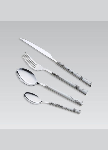 Набор столовых приборов Maestro 24 предмета (MR-1535A-24) Столовая ложка – 6 шт. Столовая вилка – 6 шт. Столовый нож – 6 шт. Чайная кровать – 6 шт. Изготовлены из высококачественной нержавеющей стали марки 18/10 Экологически чистый материал Набор столовых приборов Maestro MR-1535A-24 содержит 24 предмета из высококачественной нержавеющей стали. Комплект состоит из ножей, вилок, столовых ложек и чайных ложек. Приборы обладают полированной поверхностью, что обеспечивает долговечность и стойкость к коррозии. Эргономичный дизайн ручек гарантирует удобство и удобство в использовании. Набор столовых приборов Maestro MR-1535A-24 из 24 предметов привносит в ваш стол нотки утонченной элегантности и современного стиля. Изготовленные из высококачественной нержавеющей стали с блестящей полированной отделкой, эти приборы сочетают в себе долговечность и изысканный внешний вид. Их продуманный дизайн и эргономичные ручки обеспечивают комфортное и приятное использование, превращая каждую трапезу в изысканное удовольствие. Столовый набор Maestro MR 1535A изготовлен из нержавеющей стали. Отличительной особенностью дизайна столовых принадлежностей является удобная мраморная белая ручка с черными прожилками.