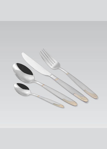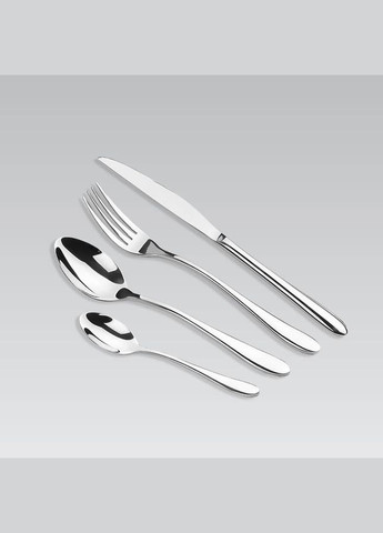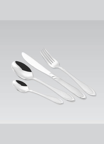Набор столовых приборов Maestro 24 предмета (MR-1514-24) Столовая ложка – 6 шт. Столовая вилка – 6 шт. Столовый нож – 6 шт. Чайная кровать – 6 шт. Высококачественная нержавейка Экологически чистый материал Набор столовых приборов Maestro MR-1514-24 содержит 24 предмета, изготовленные из высококачественной нержавеющей стали. В комплект входят ножи, вилки, столовые ложки и чайные ложки. Приборы обладают полированной поверхностью, что обеспечивает долговечность и стойкость к коррозии. Эргономичные ручки гарантируют удобство и комфорт при использовании. Набор столовых приборов Maestro MR-1514-24 из 24 предметов объединяет элегантность и практичность. Изготовленные из высококачественной нержавеющей стали с изысканной полированной поверхностью, эти приборы придают столу изящный блеск. Их эргономичный дизайн обеспечивает комфортное использование, превращая каждое застолье в удовольствие и подчеркивая вашу приверженность качеству и стилю. Столовый набор Maestro MR 1514 изготовлен из нержавеющей стали 18/10. Отличительной особенностью дизайна является комбинированный серебряный цвет столовых приборов: передняя матовая сторона ручки (с ножами вся ручка полностью) прекрасно сочетается с зеркально-глянцевой рабочей частью и задней стороной ручки (у вилок и ложек). Набор столовый Maestro MR-1514-24 станет неотъемлемой частью вашей кухни. Благодаря качеству материала, а также стильному дизайну столовый набор MR-1514-24 превратит каждый семейный ужин в настоящий праздник.