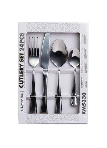 Неотъемлемой составляющей при сервировке стола являются приборы, занимающие определенное место у каждого приглашенного гостя. Торжество будет более изысканным, если Ваш стол украсят красивые столовые приборы Kamille. Благодаря своему стильному дизайну и высокому качеству такие столовые приборы будут не только дополнять красотой Ваши блюда, но и помогут создать хорошую атмосферу для ужина. Материал: высококачественная нержавеющая сталь Комплект: 6 столовых ножей 6 столовых вилок 6 столовых ложек 6 чайных ложек Особенности: индивидуальный дизайн изящные линии и формы зеркальная полировка долговечны в использовании легко очищаются и моются