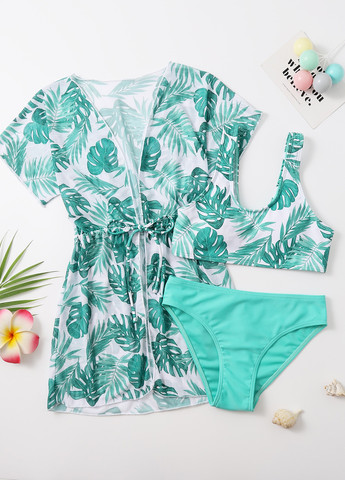 Комплект бикини с тропическим принтом для девочек-подростков. Этот комплект состоит из бикини и накидки-кимоно. У купальника округлый вырез и плавки стандартной длины. Короткие рукава. Узор выполнен в тропическом стиле. Бикини изготовлено из высокоэластичной ткани на основе полиэстера и эластана. Только машинная стирка.