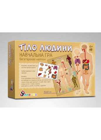 Рекомендованная для малышей старше шести лет, универсальная настольная игра обучающая с многоразовыми наклейками "Тело человека" укр. (КП-004у) KP-004y – настоящая находка для детей, которые только готовятся к поступлению в школу. Если Вы искали подходящий полезный набор, который поможет Вашему непоседе пополнить словарный запас и расширить кругозор, то эта игра создана специально для Вас. Забавная игра не только поможет Вашему ребенку получить новые знания, но и поспособствует развитию множества важных навыков. Ваш требовательный малыш по достоинству оценит все ключевые преимущества набора, ведь с помощью игры Ваш ребенок изучит, как устроены все системы органов человека, и узнает, за что каждая из них отвечает. В процессе игры Ваш непоседа сможет самостоятельно найти правильное место наклейкам-органам, тем самым закрепляя свои знания. В набор входит просторное игровое поле размером 41х60 см, многоразовые наклейки и компактная коробка со шнурком 30,5х4х21 см.