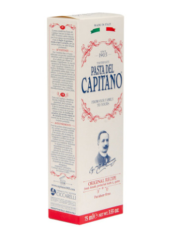 Паста Pasta Del Capitano Original Recipe не содержит консервантов и парабенов, агрессивных химических компонентов и ярких синтетических ароматизаторов. Достаточно небольшой горошины пасты для образования достаточного количества пены, что существенно сокращает расход продукта. Паста мягко, бережно, но тщательно очищает от бактерий, провоцирующих нарушения кариозной инфекции за счет натуральных антибактериальных компонентов формулы. Ими являются цинк, органические эфирные масла мяты, корицы и гвоздики. После применения Original Recipe Toothpaste ощущение чистоты и свежести дыхания не покинет вас в течение всего дня.