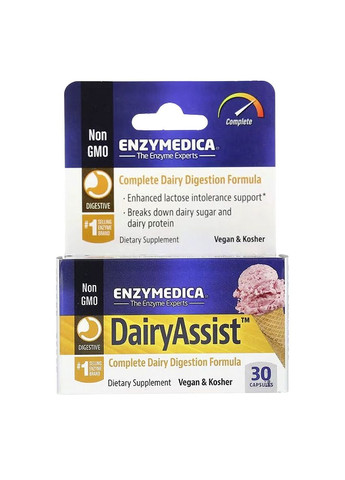 Свойства продукта: Способствует комфортному пищеварению при употреблении молочных продуктов Помогает поддерживать здоровье желудочно-кишечного тракта Поддерживает здоровье и целостность слизистой оболочки кишечника Поддерживает баланс микрофлоры кишечника Способствует снижению газообразования Показания к применению Принимать по 1 капсуле с каждым приемом пищи, содержащим молочные продукты. При необходимости дозу можно увеличить. Что это? Dairy Assist от Enzymedica - это формула двойного действия наполненная ферментами лактазой и протеазой, которые помогают расщеплять лактозу и казеин, обеспечивая поддержку в случае непереносимости молочных продуктов. С этим комплексом вы снова сможете наслаждаться любимыми молочными продуктами. Как это работает? Ферменты нужны организму не только для правильного переваривания пищи, которое не причиняет дискомфорта, но и для расщепления продуктов на жиры, белки, углеводы и клетчатку. Наш организм нуждается в таком расщеплении, поскольку только так полезные вещества могут правильно усвоиться, превратившись в энергию. В этом процессе задействована соляная кислота желудка. С возрастом секреция соляной кислоты может снижаться, в результате чего приемы пищи приносят все больше дискомфорта, что бы вы ни съели. Повысить секрецию соляной кислоты помогают пищеварительные ферменты или энзимы. Эти вещества натуральным образом влияют на работу желудочно-кишечного тракта, не причиняя вреда. Одними из таких ферментов являются лактаза и протеаза. Лактаза обеспечивает правильное усвоение молочных продуктов, не допускает процессов брожения, которые часто вызывают дискомфорт после приема пищи. Протеаза - фермент, переваривающий белки, помогает расщеплять казеин и молочные белки и способствует легкому усвоению. В результате приема Dairy Assist от Enzymedica вы не только забудете о тяжести в животе, вздутии, несварении и других неприятных симптомах, но и улучшите общее самочувствие. Элемент Вес Единица Процент Порция 1 Капсула Порций в упаковке 90 Лактаза 5000 ALU Протеаза Thera-blend 12 500 ХАТ