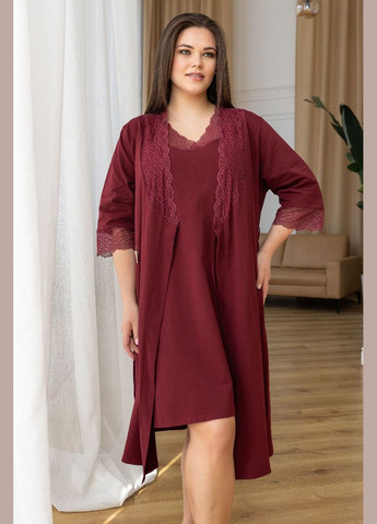 Однотонный домашний комплект халат и ночная рубашка на широких бретельках Км1110н в цвете марсала.Выполнен из натурального трикотажного хлопка, декорирован кружевом. Материал мягкий, отлично тянется, не теряет свой внешний вид, при регулярном использовании и считается самым комфортным для домашней одежды.Представлен в батальных размерах - 52, 54, 56, 58, 60, 62, 64, 66. Длина халата – 110 см.Комплект качественный и по приемлемой цене, идеально подходит для ежедневного ношения.